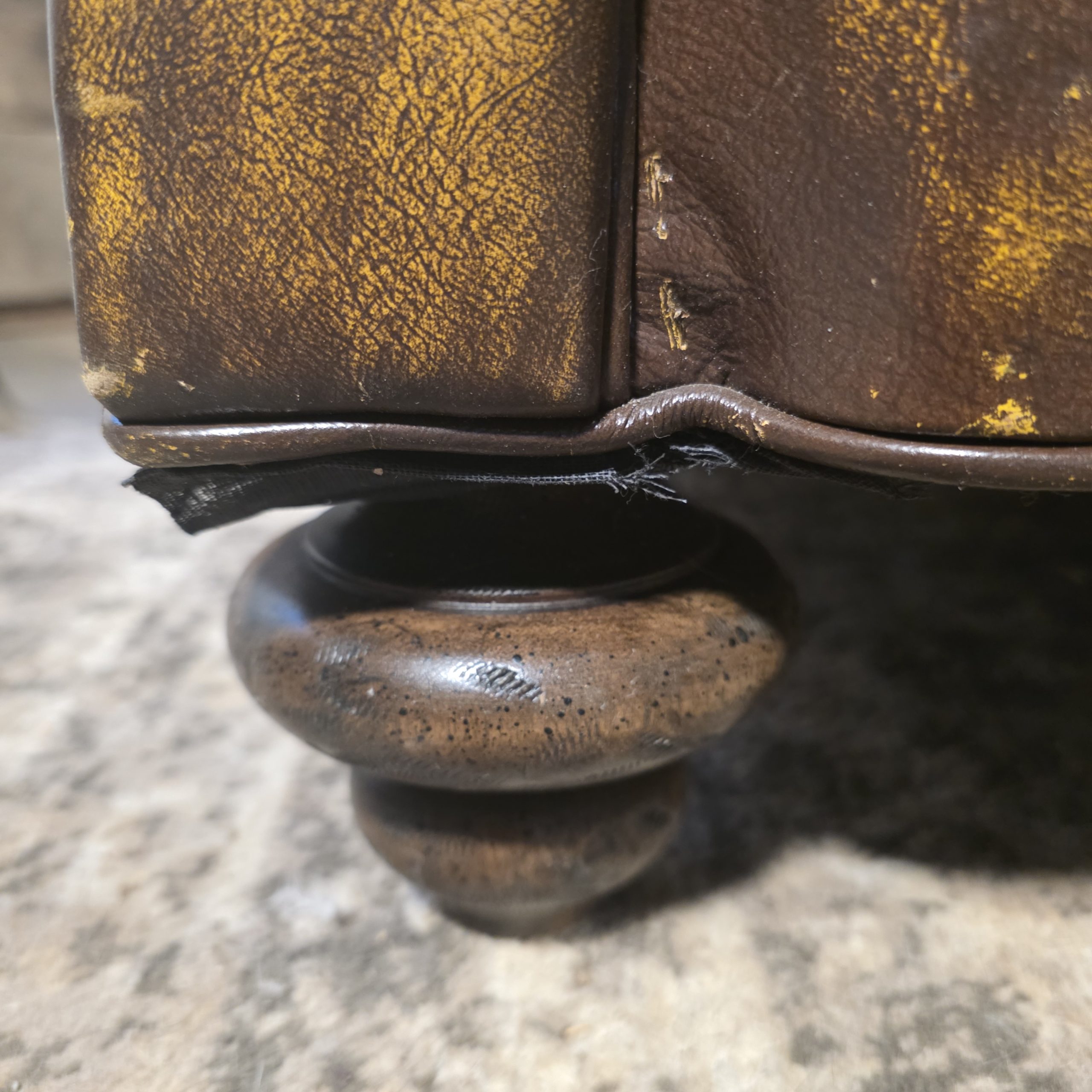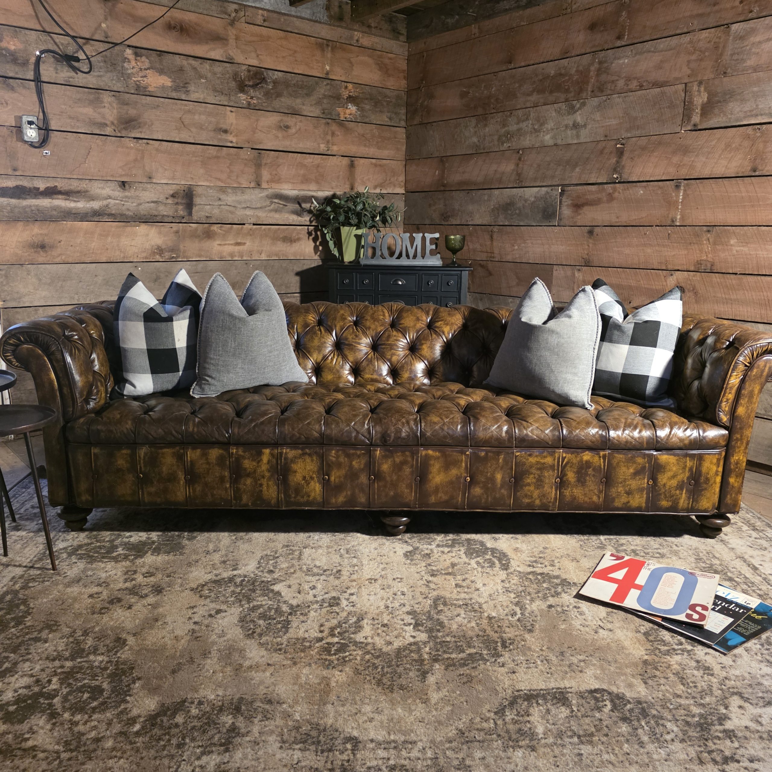 Seat is comfortably deep (approx. 22″), overall length about 96″. Legs are integrated into the frame (not screw‑on), and the sofa has that low, loungey profile designers love. Leather has a beautiful broken‑in patina with natural variation, no rips, tears, or major damage. Buttons have been professionally reattached where needed, and everything is tight and ready for daily use.
