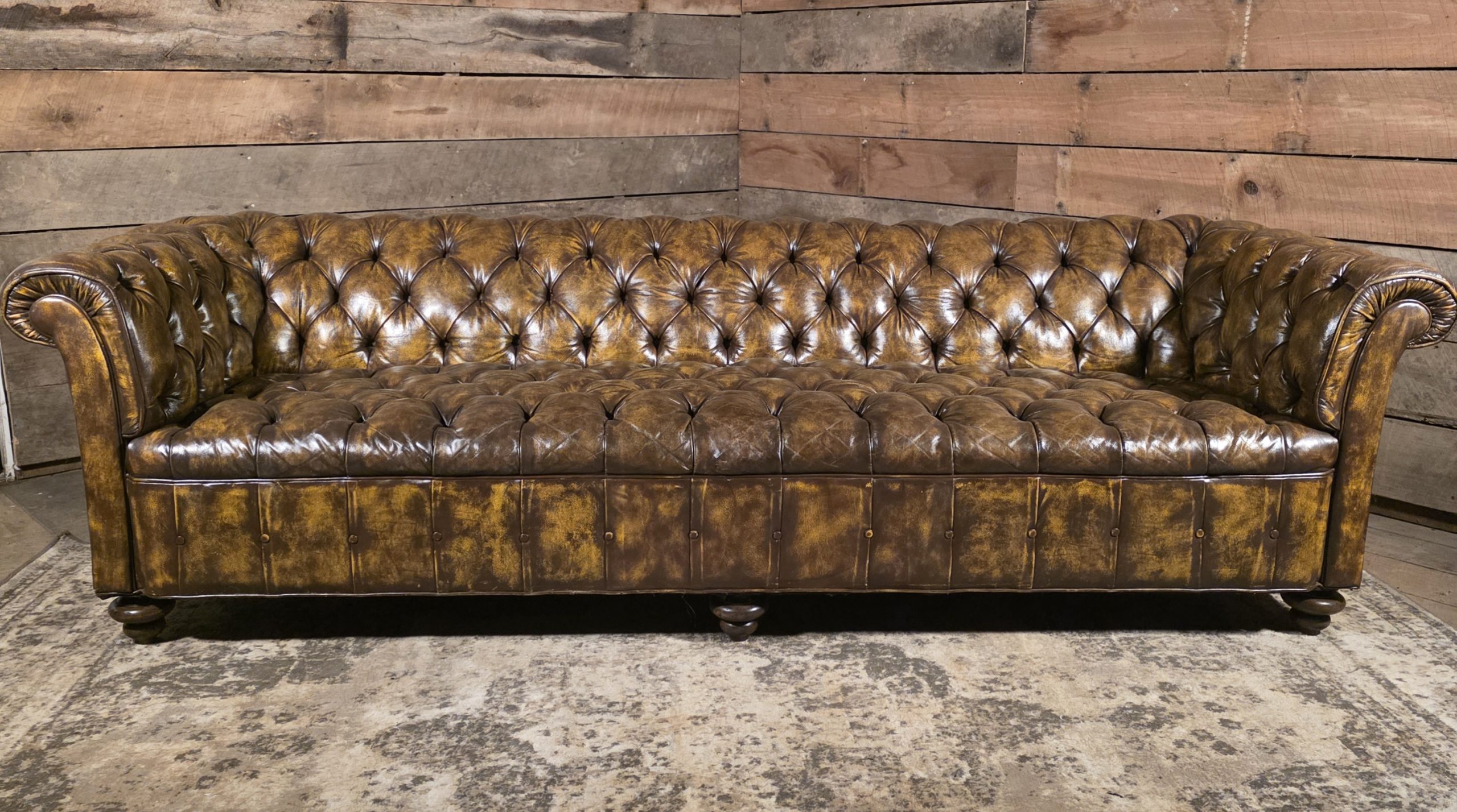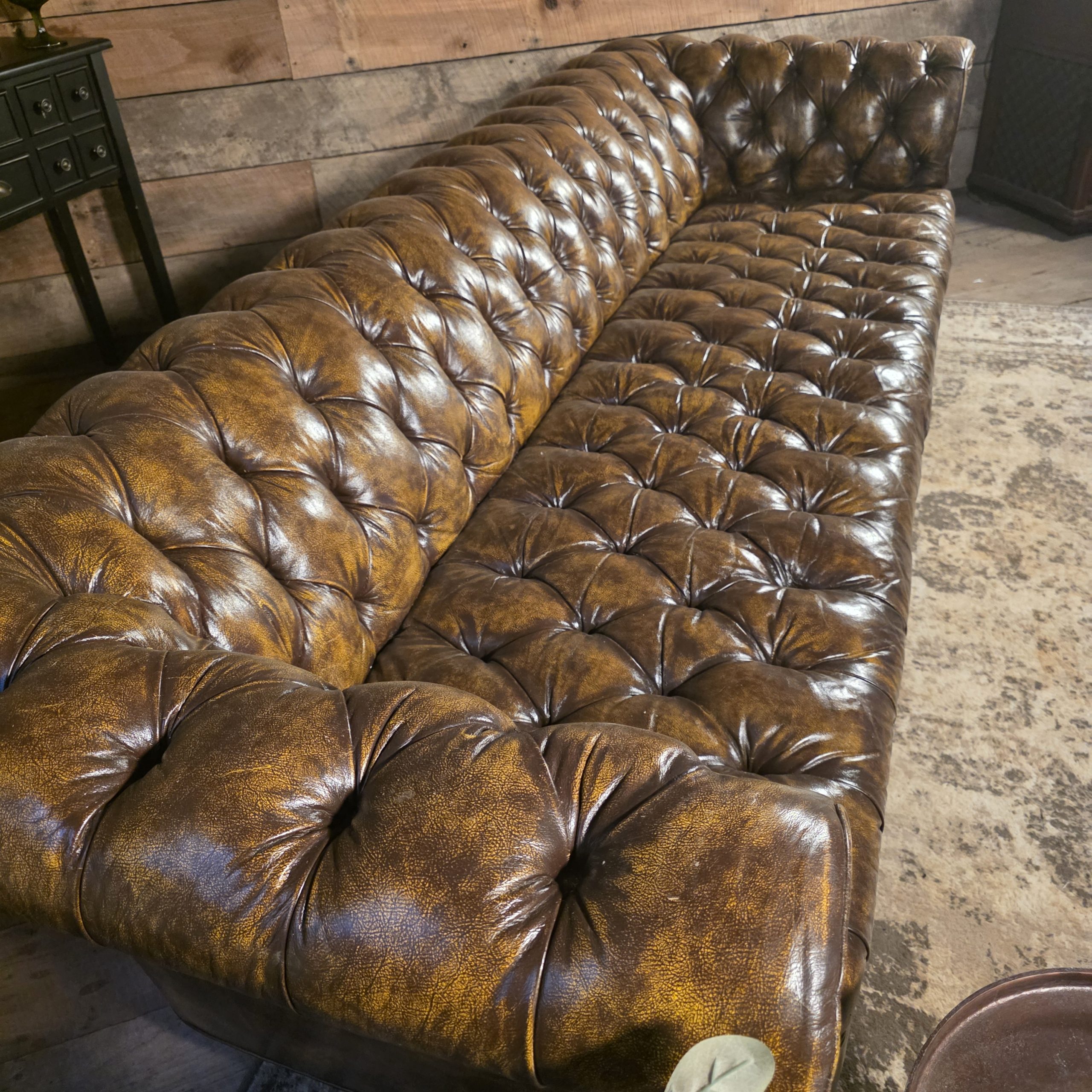 Stunning 8ft genuine leather Chesterfield sofa in rich distressed brown. Full deep diamond tufting across seat and back, classic rolled arms, and turned wood feet. Extremely heavy, with a solid hardwood frame and traditional metal spring support system – this is a serious, heirloom‑quality piece, not a lightweight box‑store sofa.