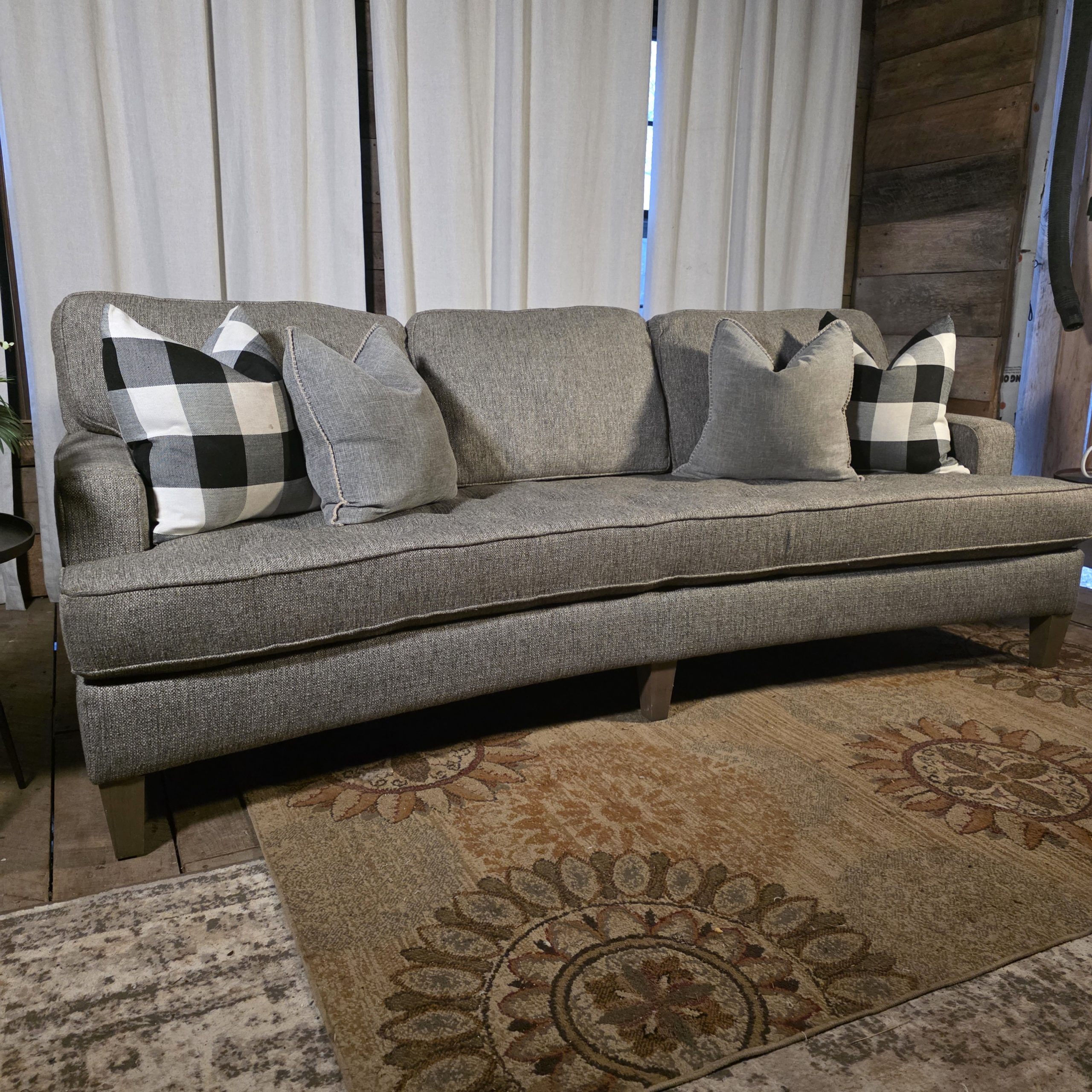 Havertys quality gray sofa in great shape, super comfy and clean. Long, slightly curved front with a deep, cushy seat and soft back cushions – plenty of room to stretch out or curl up with the family. Neutral heathered gray fabric goes with just about any style, and the simple wood legs give it a modern, relaxed look.