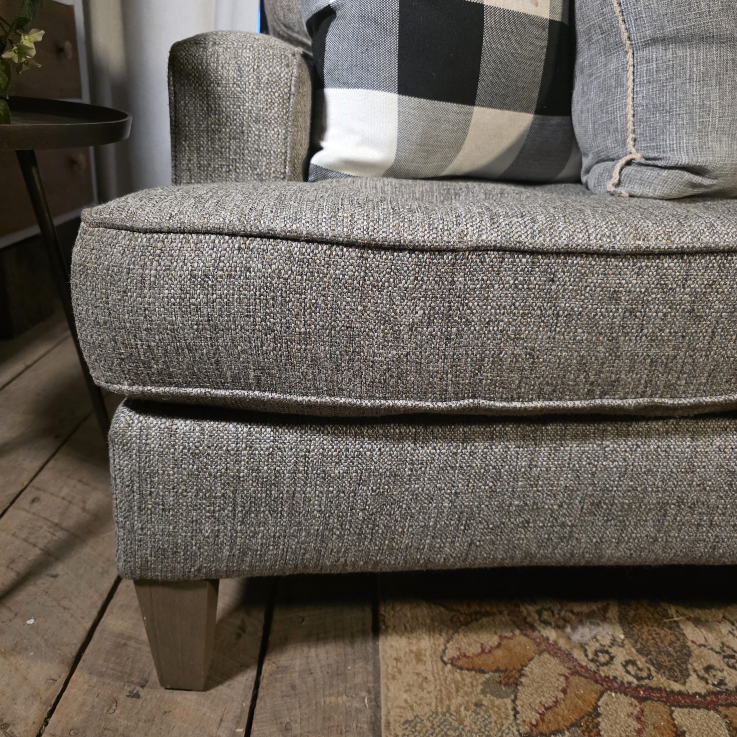 Neutral heathered gray fabric goes with just about any style, and the simple wood legs give it a modern, relaxed look. Comes from a smoke‑free home. Throw pillows not included.