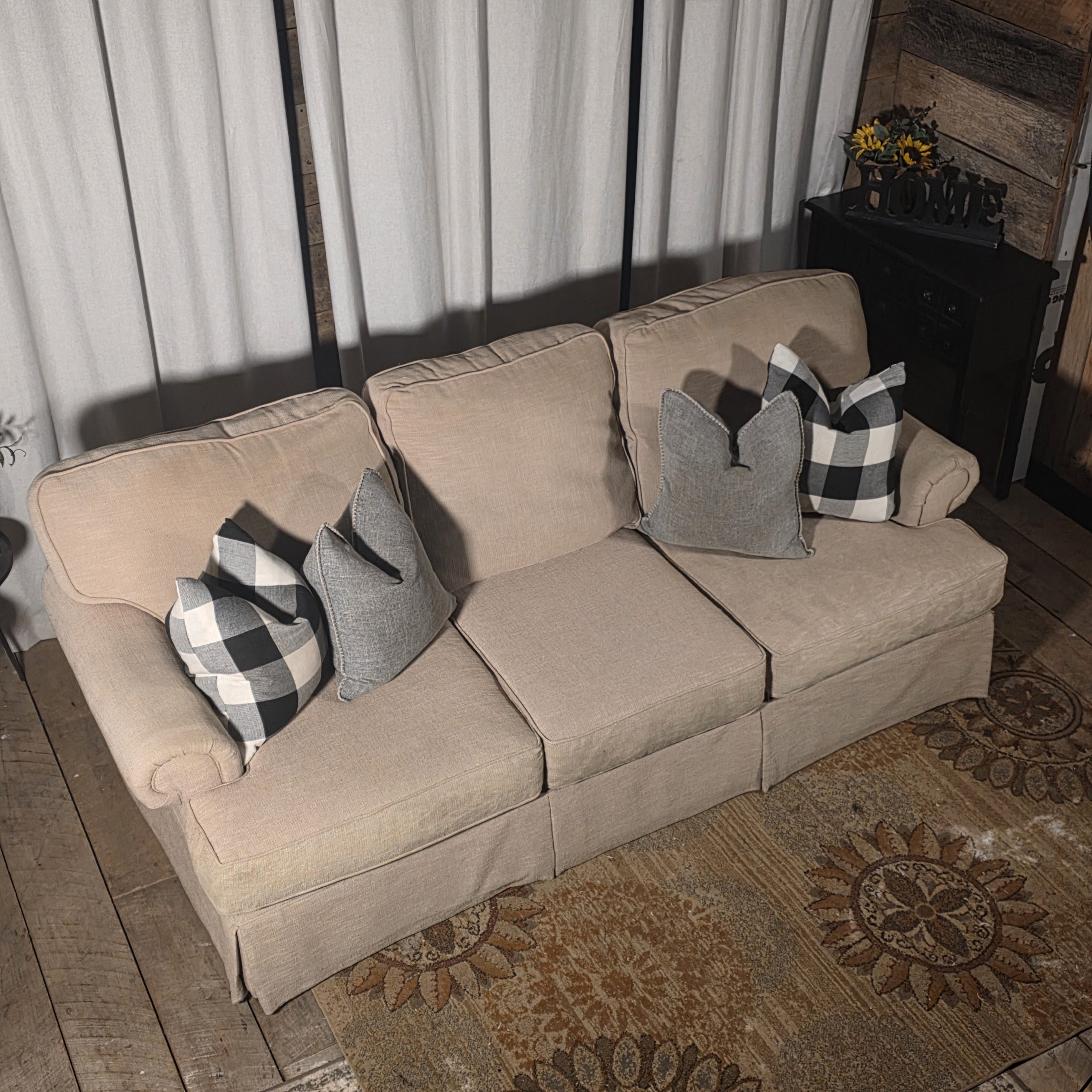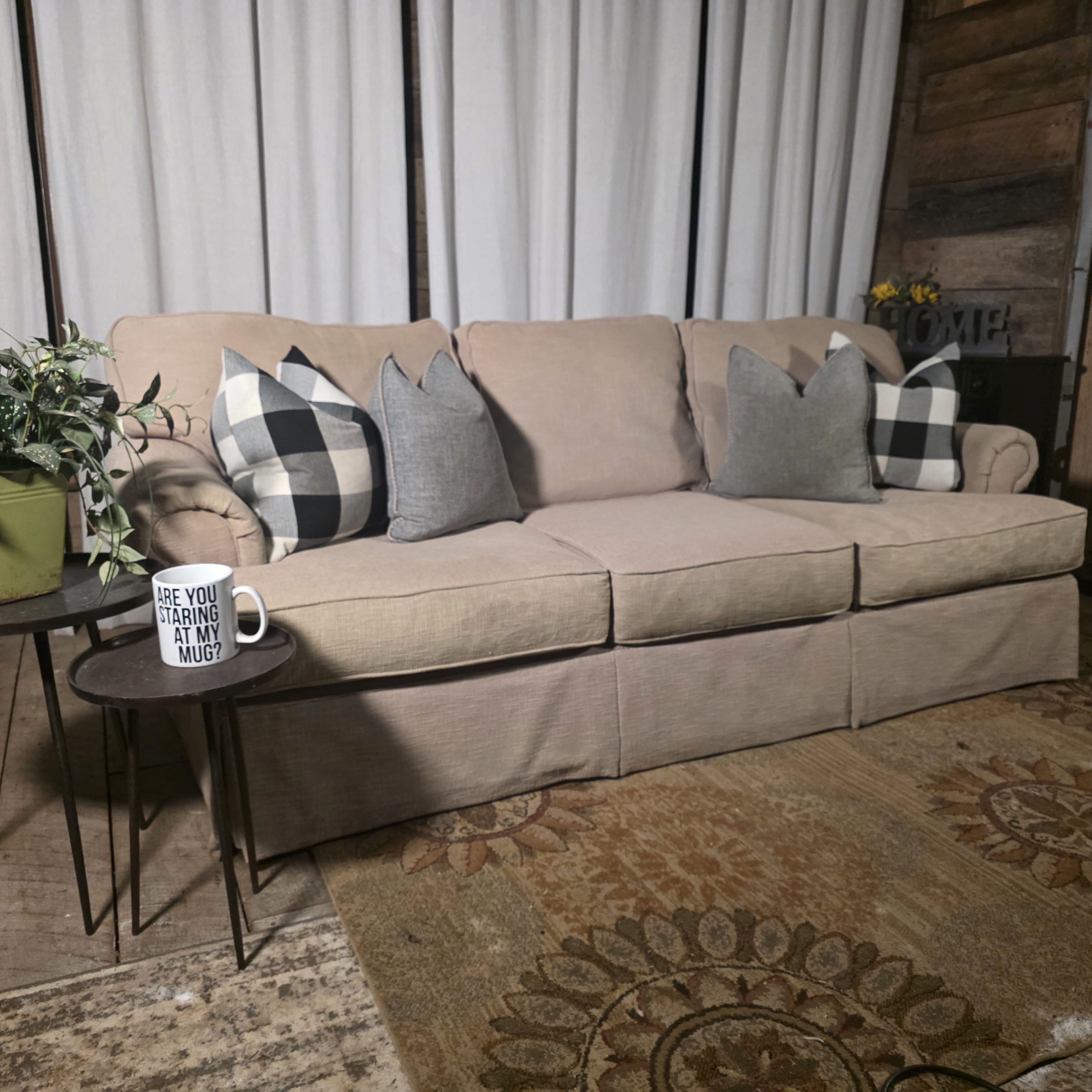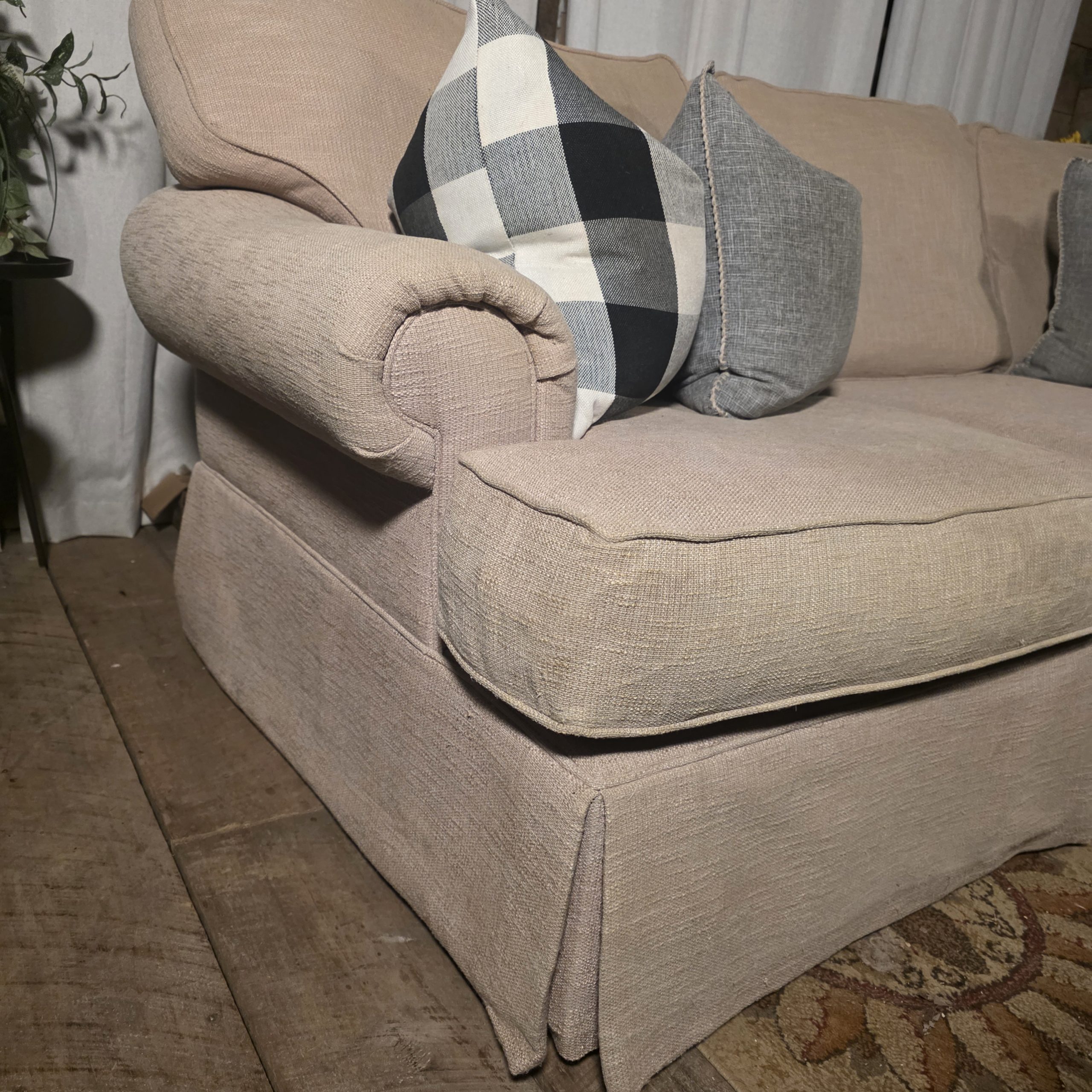 Havertys three‑seat skirted sofa in a warm neutral fabric, with classic rolled arms and a tailored full skirt that gives it a cozy, traditional look. The cushions are comfy and supportive, and the textured upholstery hides everyday wear well while still feeling soft to the touch. It seats three adults comfortably and works great in a family room, farmhouse‑style space, or anyone wanting a timeless, homey sofa that goes with almost any color scheme. From smoke-free home. Throw pillows not included.
