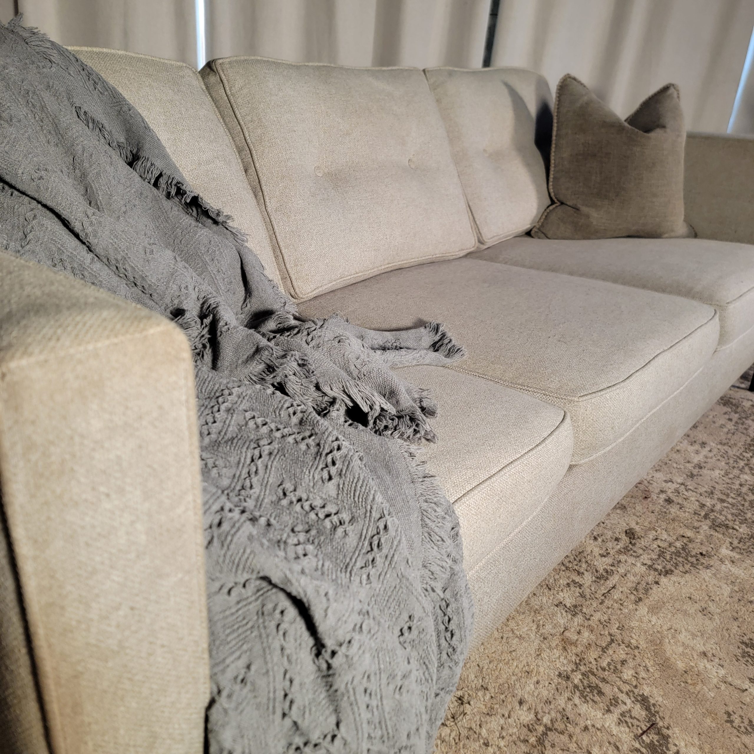Modern Sprintz brand sofa in elegant light grey, featuring a mid-century inspired silhouette and clean lines. Supportive cushions and quality neutral upholstery blend comfort and style, while the sleek metal legs add a minimalist touch. Gently used and in excellent condition—no stains, rips, or damage. From a smoke-free home and ready to update your space!