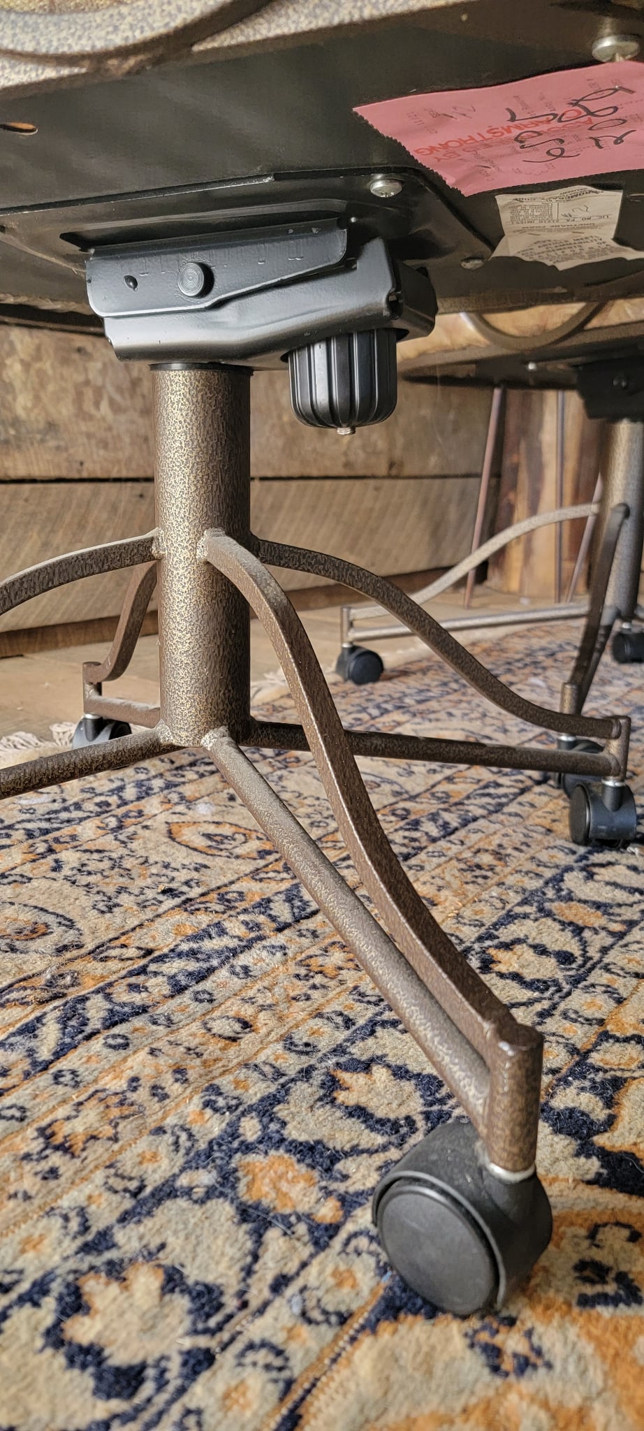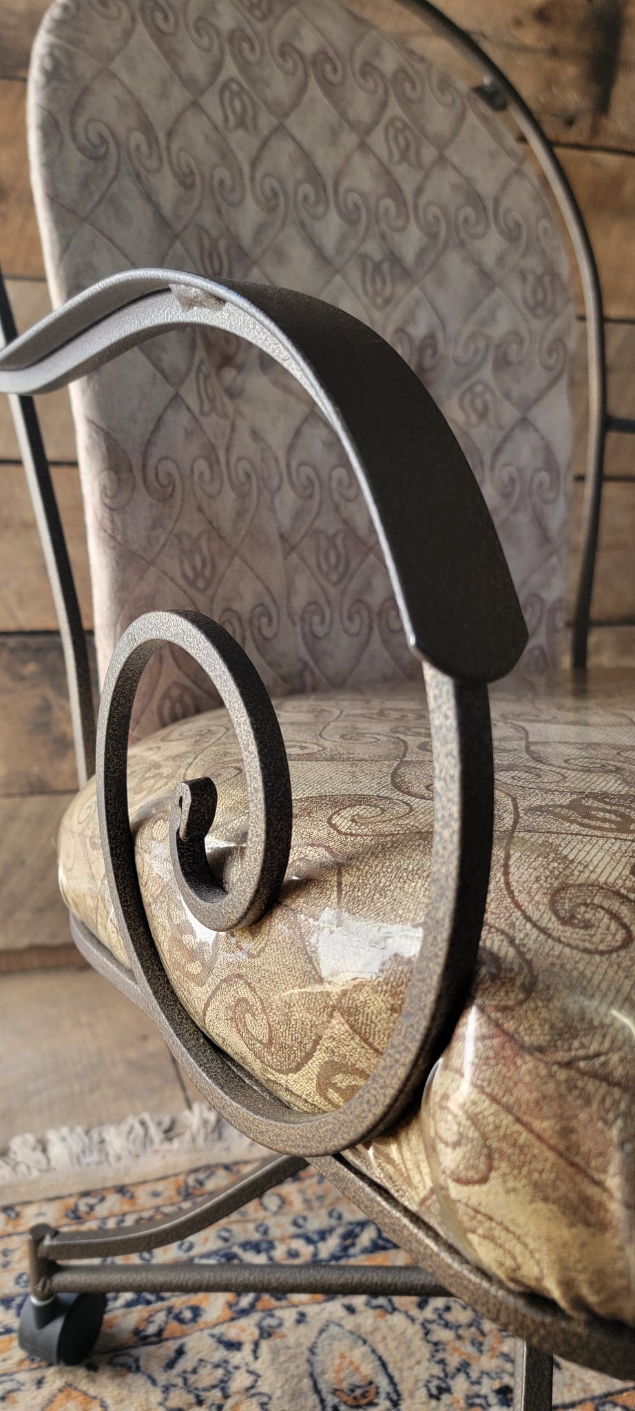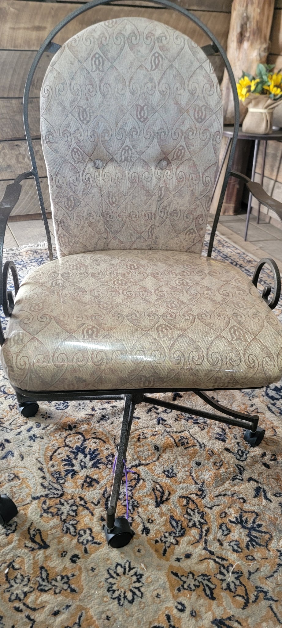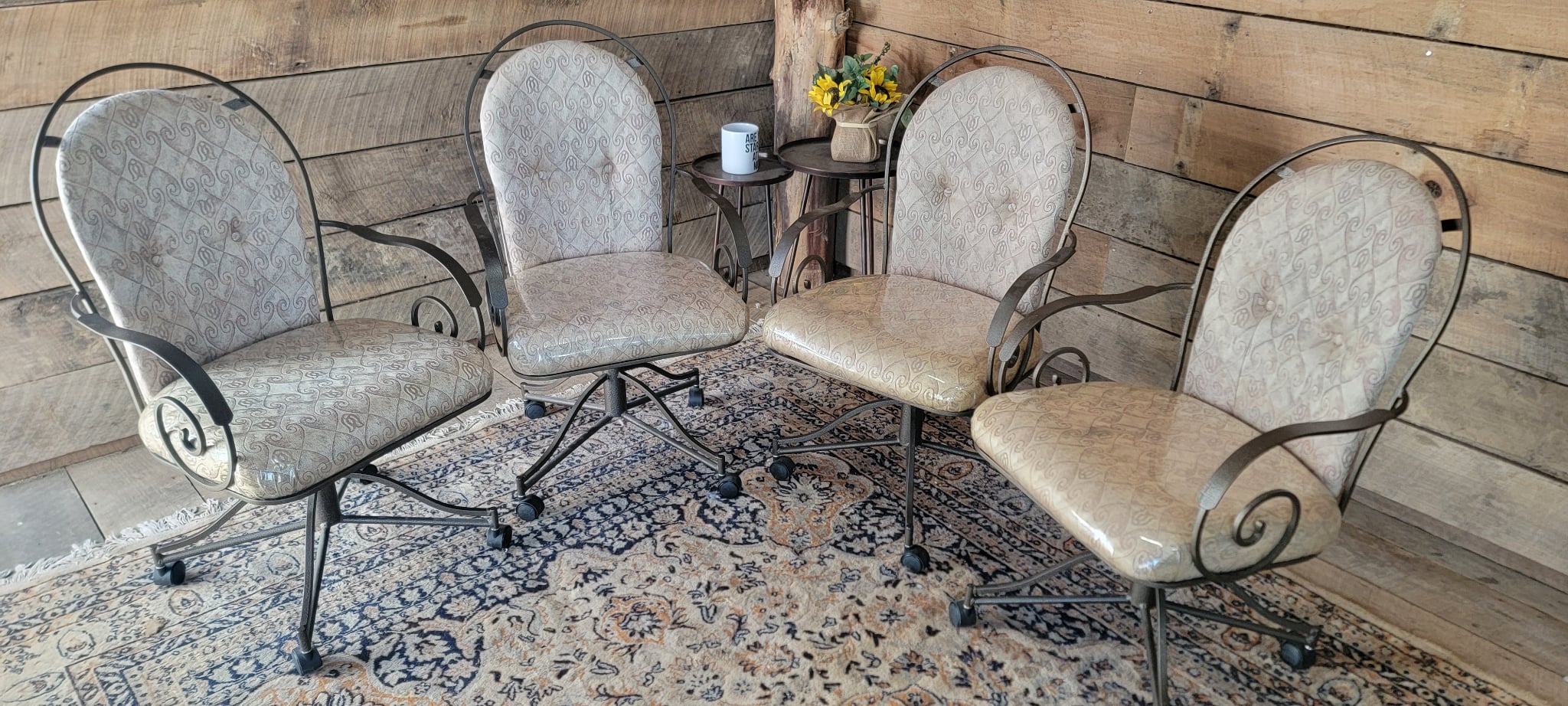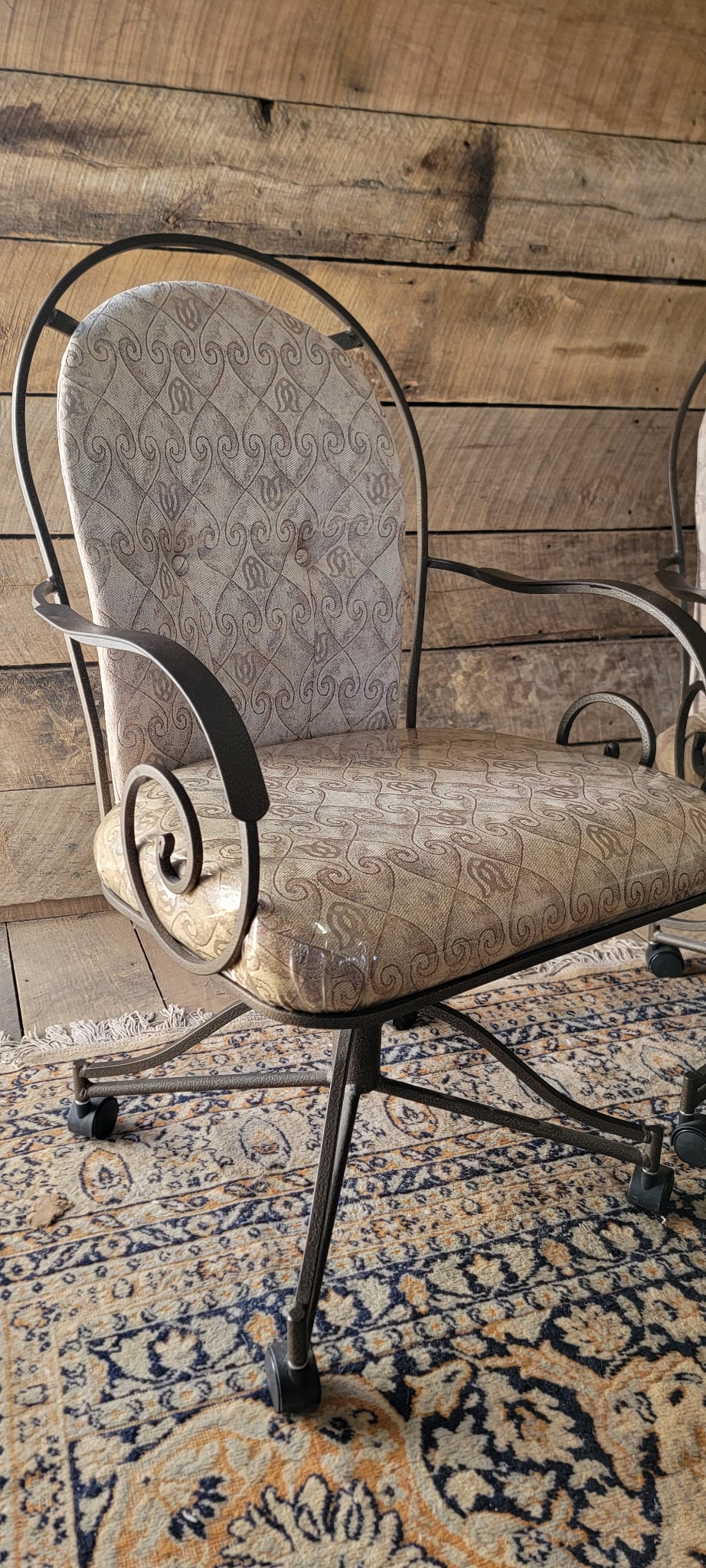 Add a touch of vintage charm to your home with this set of 4 matching swivel chairs. Each chair features a sturdy metal frame with elegant scrollwork on the arms and back, plus comfortable padded seats and backs in a neutral patterned upholstery. The chairs are on smooth-rolling casters, making them perfect for a dining area, game room, or office. All are in good used condition with minor wear consistent with age.